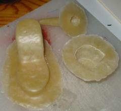 When there are enough layers and the latex is dry, it is time to remove the mould from the master. First apply some talcum powder on the mould to keep its parts from sticking into each other. Stretch the mould as needed to get it off and turn it inside out. Apply talcum powder also to the inside to keep it from sticking and turn the mould back the right side out.